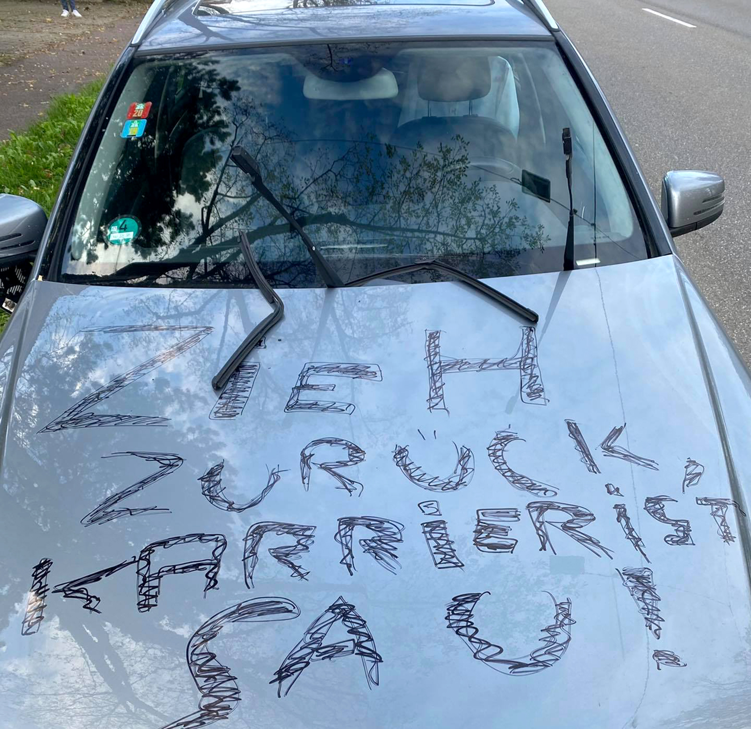 Das Auto von Schreier wurde an verschiedenen Stellen beschädigt. Zahlreiche Kratzer zieren das Auto, der Seitenspiegel sowie die Scheibenwischer wurden demoliert. Auf der Motorhaube wurde eine unmissverständliche Nachricht hinterlassen: „Zieh zurück, Karrierist Sau“. Schreier teilte am Mittag auf seiner Facebookseite mit: „Ich bin als Kommunalpolitiker einiges gewohnt und will die Sachbeschädigung nicht überbewerten, wünsche mir aber, dass wir wieder zu der fairen, an der Sache orientierten Diskussion des ersten Wahlgangs zurückkehren.“