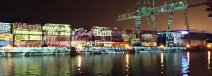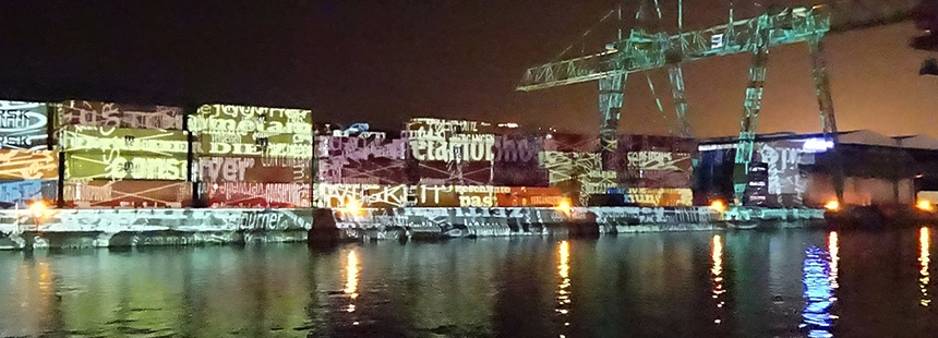 Für eine Videoinstallation am Stuttgarter Hafen wurden im Vorhinein Wörter gesammelt, die dann auf die Container projektiert wurden. Leider hat es das Wort „STUGGI.TV“ nicht in die engere Auswahl geschafft, dafür aber „time“ und „Kran“.