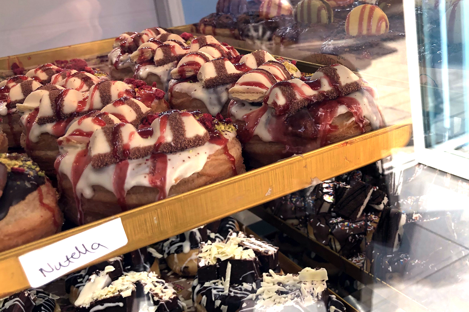 Wenn man den Laden betritt, fühlt man sich kurz wieder wie ein Kind im Spielzeugladen. Die leuchtenden pinken und hellblauen Farben sind dabei nicht das Einzige fürs Auge. Hinter einer Glasscheibe befindet sich eine Theke mit einer großen Donut-Auswahl von ungefähr dreißig bis vierzig verschiedenen Sorten, sodass man die fünf Warteminuten gerne in die Entscheidungsfrage investiert. Dabei lassen die Betreiber keinen Food-Trend aus: Neben Toppings mit verschiedenen Schokoriegeln und Oreos hat Royal Donuts auch Cronuts, also Donuts aus Croissant-Teig, im Angebot.