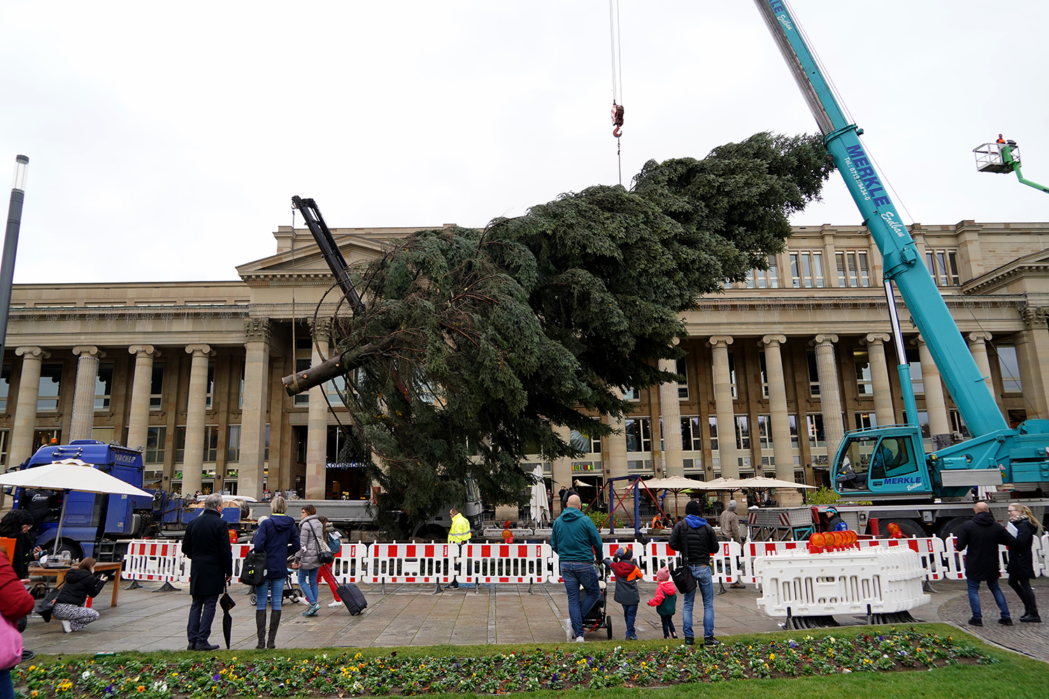 Über fehlende Highlights kann man sich am Schlossplatz nicht beschweren. Das Riesenrad vor dem Neuen Schloss und nun der meterhohe Weihnachtsbaum auf der anderen Seite schmücken den Stuttgarter Schlossplatz. Das solle auch ein Zeichen der Hoffnung sein. In den nächsten Tagen wird der Baum noch festlich geschmückt. Zahlreiche Lichterketten mit etwa 45.000 LED-Lämpchen und energiesparendem Ökostrom erhellen dann die Stadt. Außerdem wird der Sockel rund um den Stamm mit Tannenreisig verkleidet und mit einer großen Holzkrippe umbaut. Verzichten muss man in diesem Jahr wegen der Unwettergefahr und Sturmwarnungen auf den großen Stern an der Baumspitze.