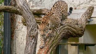 Gespannter Augenblick: Erstmals seit 23 Jahren standen sich in der Wilhelma wieder zwei Jaguare gegenüber. Mit Milagro ist der künftige Partner von Taima in das Nachbargehege eingezogen. Bereits vom ersten Moment an knisterte es sichtbar: Die vierjährige Taima kam sofort ans Gitter gesprungen und hüpfte erwartungsvoll hin und her. Obwohl schon groß und kräftig, erstarrte der noch keine anderthalb Jahre alte Kater dagegen zunächst, als er die Artgenossin von einer Aussichtsplattform aus entdeckte. Jeden Muskel angespannt, fixierte er sie gebannt, bevor er von seinem Ausguck heruntersprang und sich ihr langsam näherte, um Kontakt aufzunehmen. Bis die beiden Jaguare zusammengelassen werden, muss Milagro allerdings noch etwas älter werden.