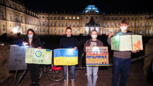 Entstanden ist der stille Protest durch die Zusammenarbeit der vier Kreisvorsitzenden Amelie Montigel (Grüne), Thrasivoulos Malliaras (CDU), Gabriele Reich-Gutjahr (FDP) und Dejan Perc (SPD). In einer Chatgruppe hat sich das Vierer-Bündnis in den vergangenen Wochen mehrfach ausgetauscht. Dabei entstand die Idee zur Lichteraktion. Federführend geplant und angemeldet hat die Demonstration die CDU Stuttgart. „StandWithUkraine ist heute Abend mehr als ein Hashtag“, sagt CDU-Chef Thrasivoulos Malliaras am Mikrofon bei STUGGI.TV (Video unten). Laut Veranstalterangaben haben sich rund 1000 Menschen an der Kundgebung beteiligt.