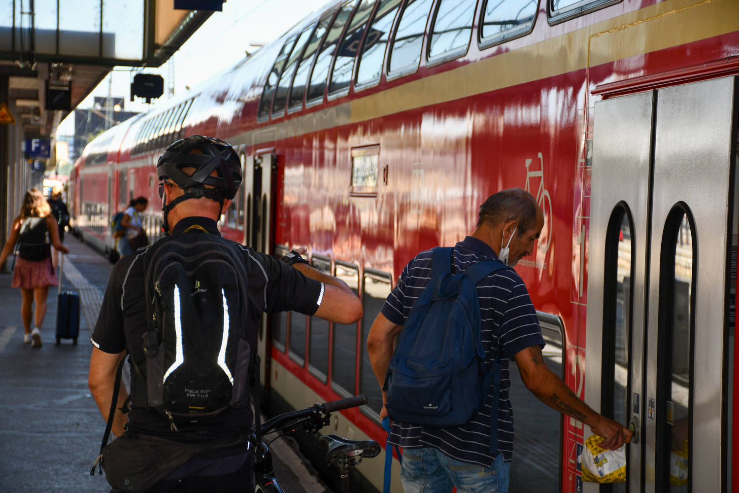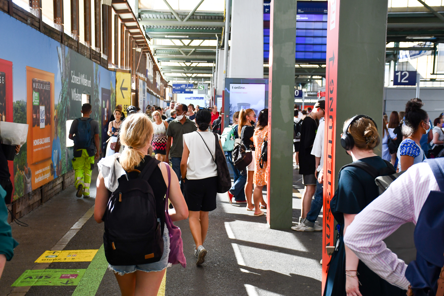 Der Zug fährt pünktlich (!) um 11 Uhr am Stuttgarter Hauptbahnhof ab. Im Zug selbst stelle ich direkt fest: Es ist ziemlich voll. Einige wenige Plätze gibt es aber noch. Ich spreche eine junge Frau an, die auf dem Sitz neben sich ihre Handtasche stehen hat. Etwas widerwillig nimmt sie die Tasche von dem Platz und stellt sie unter ihren Sitz auf den Boden. So sitze ich da, mit rund 20 anderen an der Wand des Wagons, wie Hühner auf einer Stange. Die Bewegungsfreiheit rechts und links ist nicht wirklich groß, reicht aber gerade so aus. Neben Unterhaltungen und ein bisschen Kindergeschrei läuft aber zumindest die Klimaanlage im Zug. Bei den heißen Temperaturen und Maskenpflicht ein wichtiger Faktor.