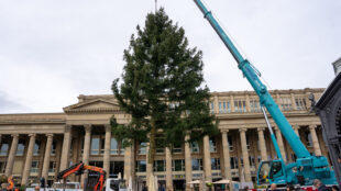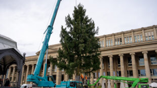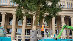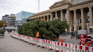 Traditionell beginnt die Adventszeit in Stuttgart mit dem Aufstellen des Weihnachtsbaumes auf dem Schlossplatz. Seit dem heutigen Mittag steht die 22 Meter hohe und rund 75 Jahre alte Weißtanne vor dem Königsbau und stimmt die Stuttgarter auf die Vorweihnachtszeit ein. Mit einem Schwertransporter wurde der Baum aus dem Welzheimer Wald nach Stuttgart transportiert und mit Kränen aufgestellt. Zwei weitere große Weihnachtsbäume stehen auf dem Marktplatz vor dem Rathaus sowie auf dem Schillerplatz. In den nächsten Tagen werden die Bäume noch festlich geschmückt und sollen dann für weihnachtliche Atmosphäre in der Innenstadt sorgen.