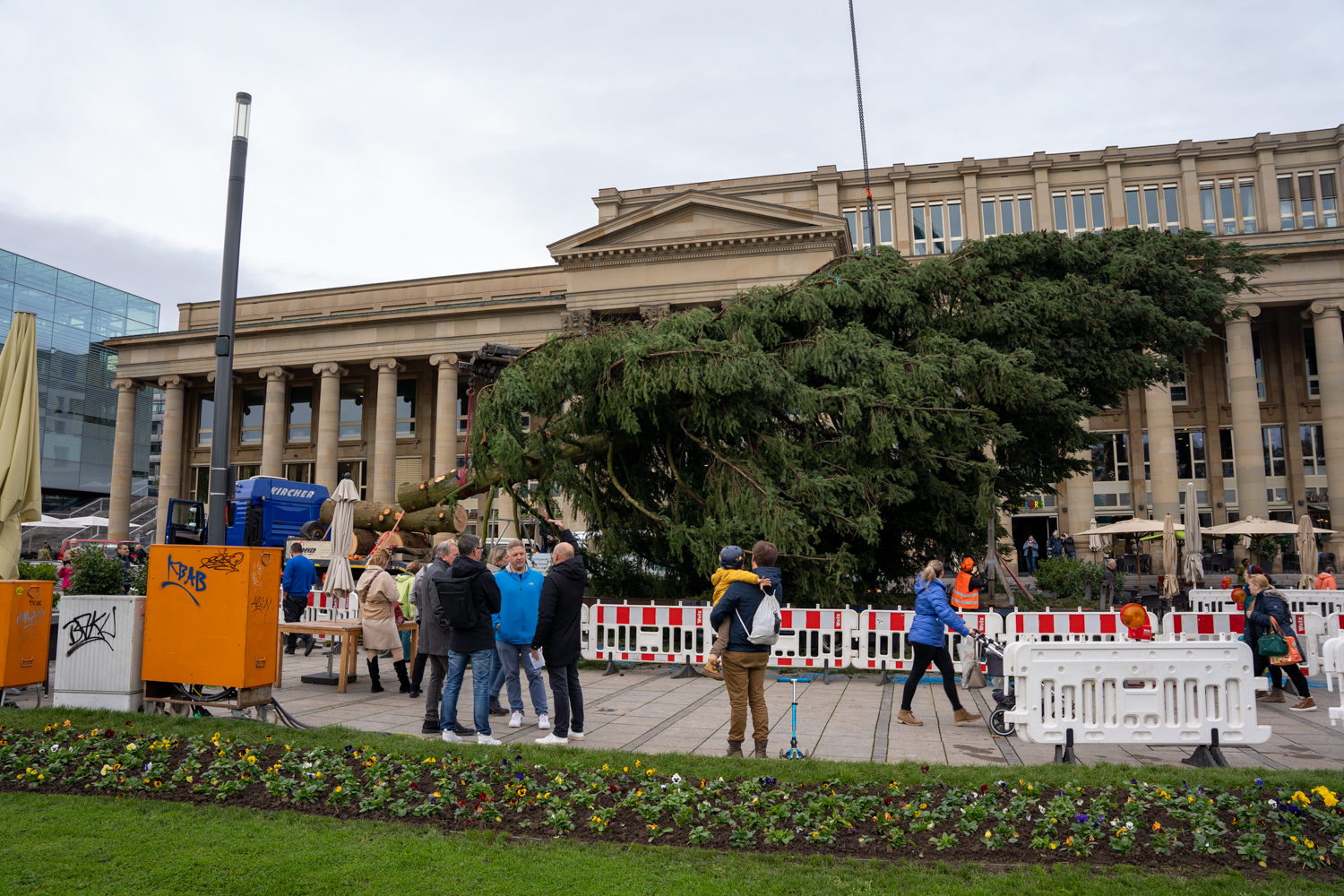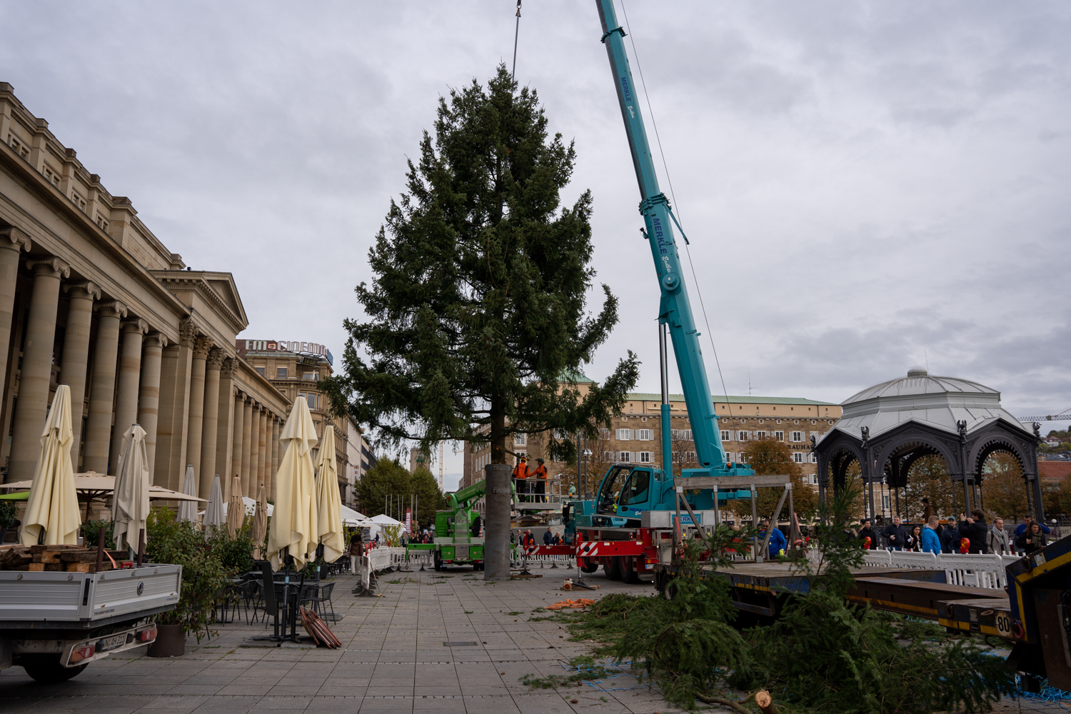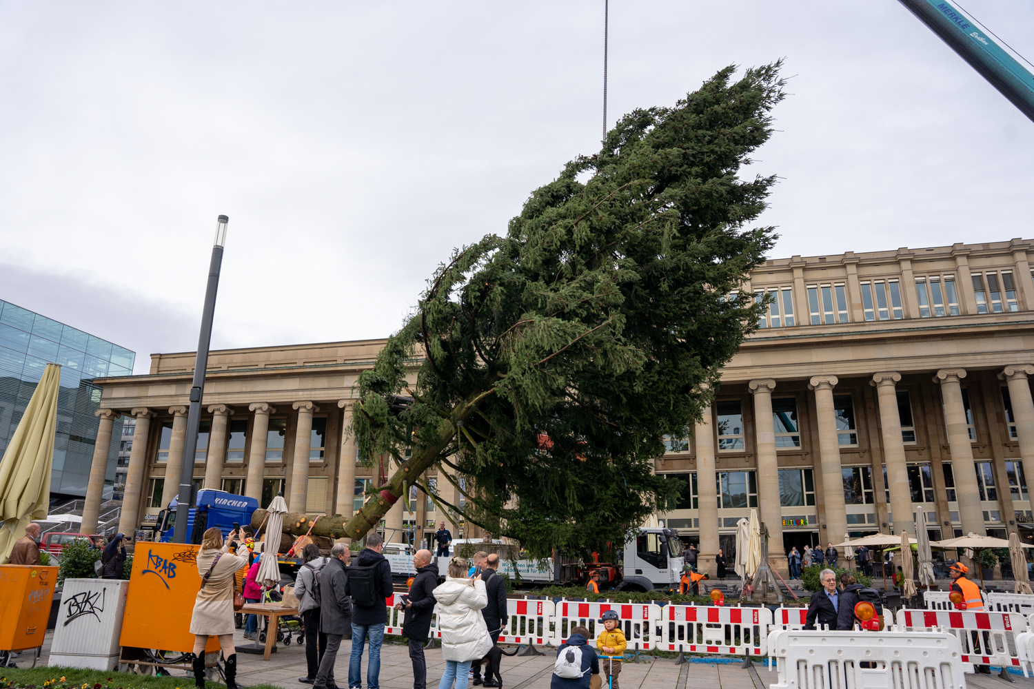 Die Adventszeit ist eingeläutet: Am heutigen Freitag wurde der große Weihnachtsbaum auf dem Schlossplatz aufgestellt. In den nächsten Tagen wird die 22 Meter hohe Weißtanne noch hübsch geschmückt und soll dann für weihnachtliche Atmosphäre in der Innenstadt sorgen. Mit dem Start des Weihnachtsmarktes Ende November soll Stuttgart dann trotz Energiekrise wieder zur stimmungsvoll leuchtenden Weihnachtsstadt werden.