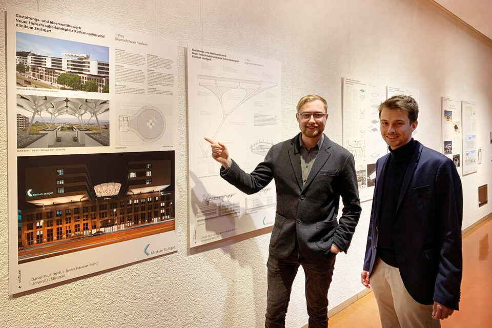 „Wir sind dankbar und begeistert, dass das Klinikum die Stuttgarter Hochschulen und ihre Studierenden in ein solches Verfahren einbindet“, heißt es von Daniel Pauli und Jannis Haueise vom Siegerteam der Uni Stuttgart. Es mache sie stolz, dass ihr Vorschlag umgesetzt wird, zumal der Hubschrauberlandeplatz in unmittelbarer Sichtweite des Campus steht. Betreut wurde das Team vom Institut für Baukonstruktion und dem Institut für Tragkonstruktionen und konstruktives Entwerfen der Uni Stuttgart. Der Hubschrauberlandeplatz wird als Teil des Neubaus vom Katharinenhospital voraussichtlich bis 2028 fertig sein.