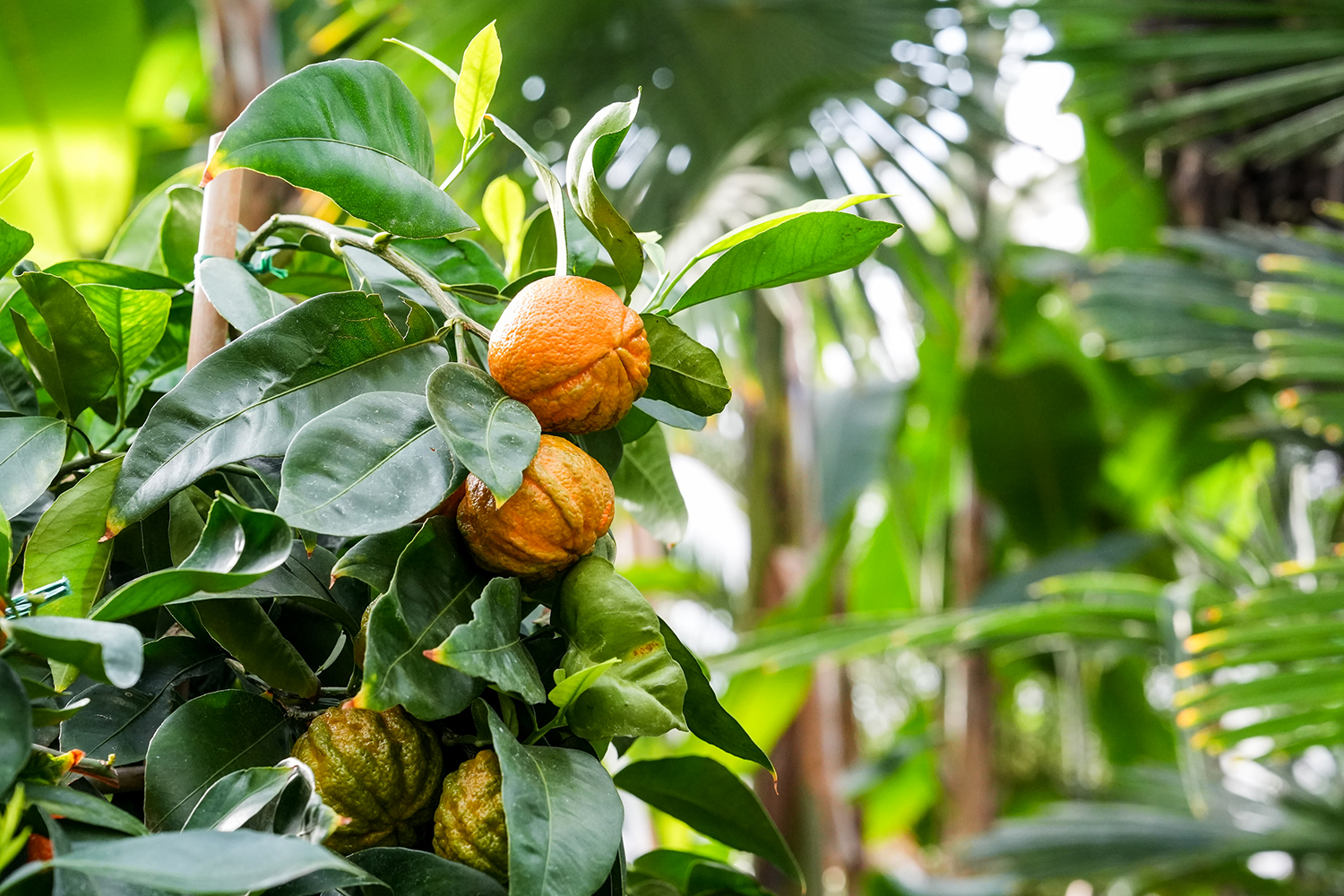 Die Wilhelma zeigt beispielsweise die Kaffir-Limette. Ihre runzeligen, saftarmen Früchte haben weder optisch noch geschmacklich viel zu bieten. Dafür sind die Blätter in der asiatischen Küche beliebt und geben Suppen und Soßen eine pikante Note. Die Rangpur-Limette strahlt in leuchtendem Orange und schmeckt sowohl süß als auch bitter. Zu den historischen Sorten gehört die Gefurchte Pomeranze, eine Bitterorangen-Variante, die schon seit dem 16. Jahrhundert bekannt ist. Die Früchte fallen durch ihre markanten Erhebungen auf und sind unverarbeitet nicht verzehrbar. Schmackhaft wird die Pomeranze erst in Form von Marmelade oder als Gewürz.