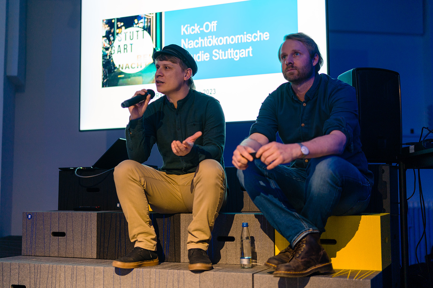 Nachtmanager Nils Runge (li.) und Andreas Topp von der Wirtschaftsförderung der Stadt Stuttgart stellen die nachtökonomische Studie vor. (Foto: Ludmilla Parsyak, Rechte: LHS)