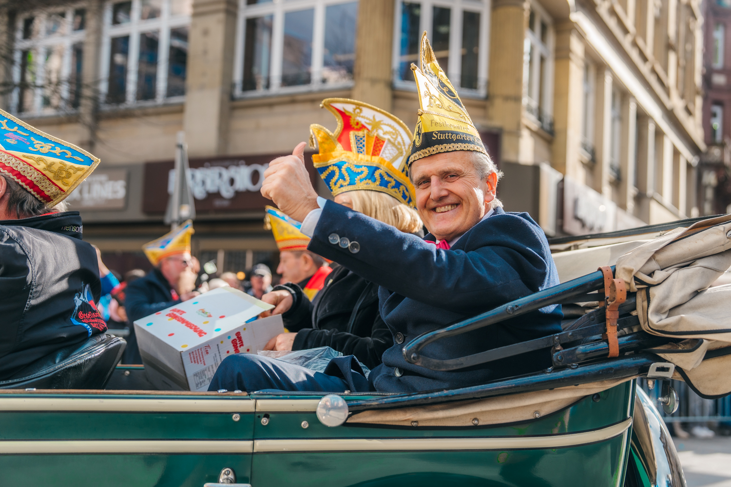 Die über vierzig Karnevalsvereine aus Stuttgart un der Region präsentierten ihre Kostüme und Festwagen. Von den Wägen wurden Tonnen von Süßigkeiten in die Menge geworfen. Angeführt wurde der Umzug von einem Wagen von Antenne 1 gefolgt von Oberbürgermeister Frank Nopper und seiner Gattin Gudrun Nopper. Im Schlepptau das Stadtprinzenpaar Hannes und seiner Frau Melaine und viele weitere gut gelaunte und kostümierte Narren.