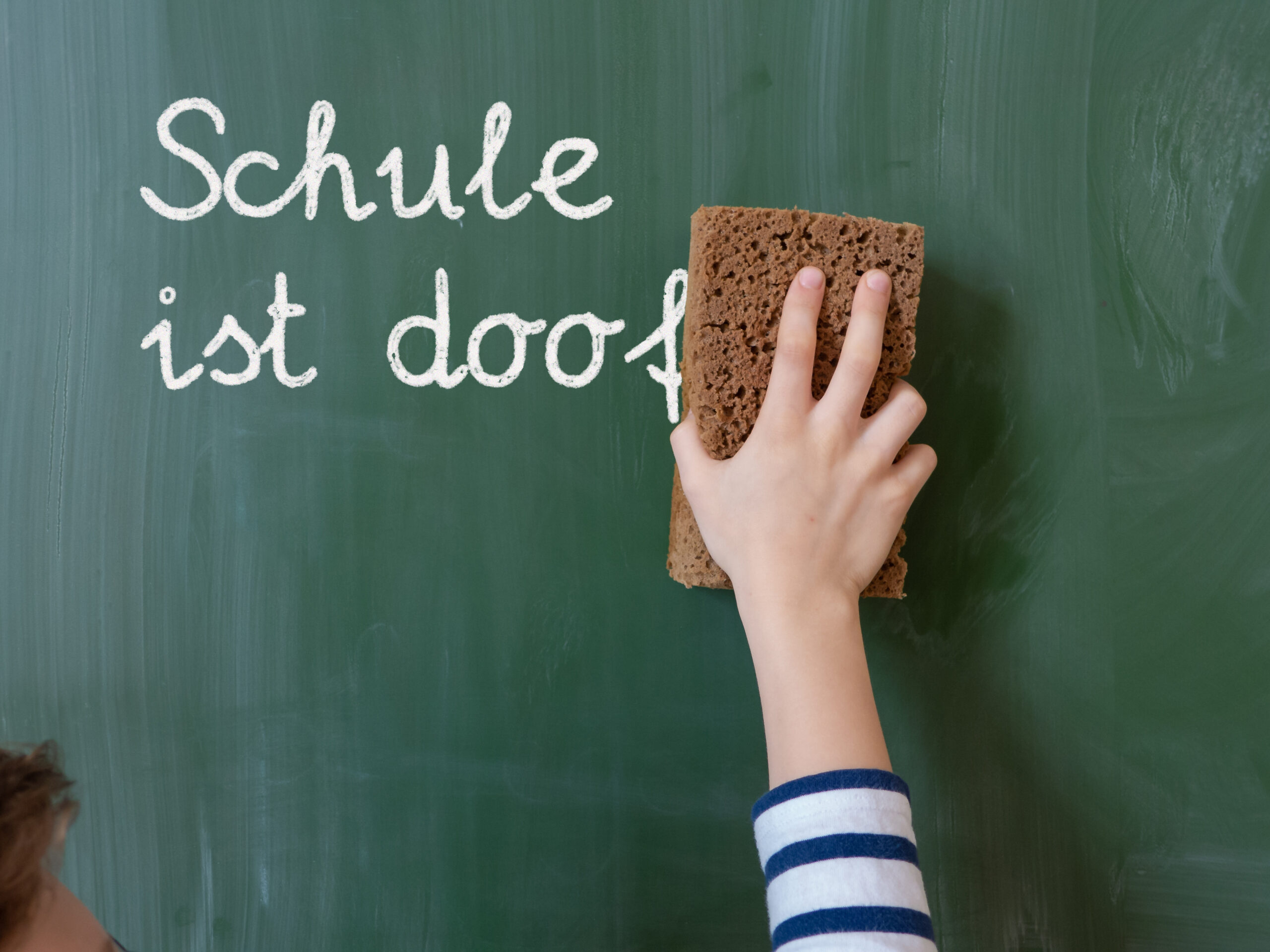 Kind wischt Text „Schule ist doof“ von der Tafel