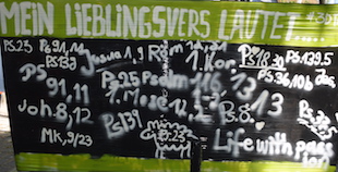 Was ist eure Lebensweisheit? Wer auf der Jugendmeile in der Mercedesstraße unterwegs war, konnte sich die Spraydose schnappen und nach Lust und Laune seine persönliche Antwort darauf sprayen. „Focus“ war die Weisheit der Woche. Ganz nach dem Motto: „Fokussiere dich auf das, was du willst und kannst. Sei es die eigenen Stärken, gute Noten oder Freude am Leben.“ Geholfen haben den Jugendlichen dabei ihre Lieblingsverse aus der Bibel, die sie ebenfalls auf die Leinwand sprayten.