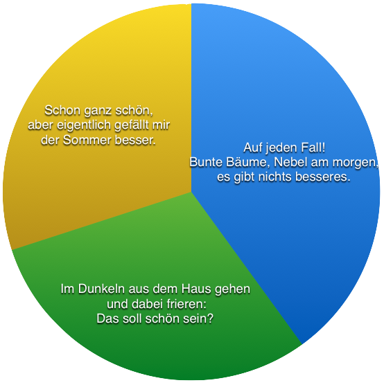 Eine knappe Mehrheit von euch mag den Herbst: 40% haben für die Antwort im blauen Kuchenstück gestimmt. Genau 30% sind gegenteiliger Meinung: Für sie ist der Herbst ein unnötiges Übel. Ebenfalls 30% haben für die goldene Mitte gestimmt: „Schon ganz schön, aber eigentlich gefällt mir der Sommer besser.“