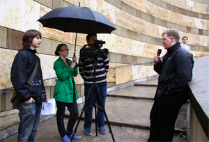 Gemeinsam suchen wir uns ein besonders schönes Stück des Staatsgalerie-Gebäudes und bauen unser Kamera-Zeugs auf. Mit großem Stolz wird unser brandneue Mikrofon montiert, wunderschön, mit super Quali und vorallem kabellos. Leider fehlt noch das Windfangschäumchenpuschel-Dings, aber das kommt noch.