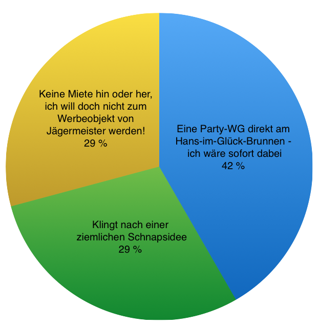 42% unter euch finden die Aktion super und würden ohne Bedenken mitmachen und einziehen. 29% halten die ganze Kampagne für eine „Schnapsidee“, wohl nicht nur auf Grund des Kräuterlikörs. Die anderen 29% möchten nicht zum Werbeobjekt für Jägermeister werden und lehnen das verlockende Angebot grundsätzlich ab.