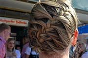 „Das hab ich eben nur kurz gemacht“, sagt uns diese junge Dame, als wir ein Foto von ihrer Frisur machen wollen. Wer also nicht viel Zeit hat, keinen Spiegel und auch keine Hilfe von anderen, der ist mit einem seitlichen Flechtzopf immer gut beraten.