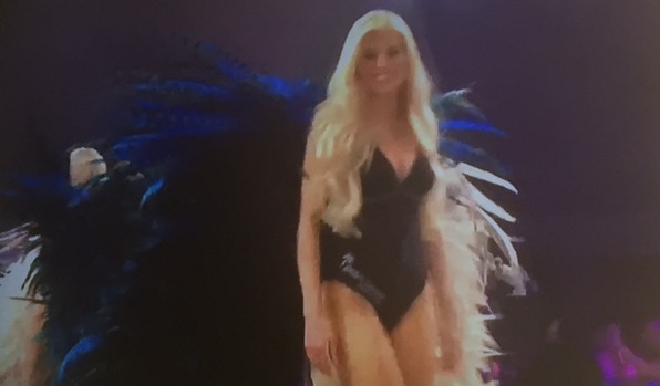 21:24 Uhr – Jetzt wird es erotisch. Beim nächsten Wertungsdurchgang kommt die Bademode zur Schau. Und Céline kommt schon gleich als zweite Miss im Badeanzug-Federkostüm.