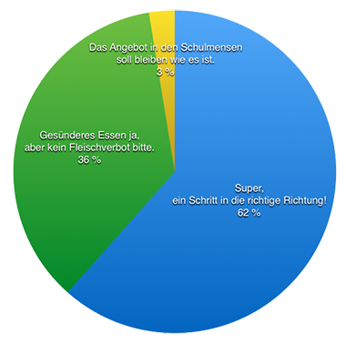 Die Teilnehmer unserer Online-Umfrage begrüßen allgemein die Pläne des Jugendrates für gesünderes und nachhaltigeres Schulessen. Nur 3 Prozent würden nichts am bisherigen Angebot ändern. Nich ganz so einig sind sich die Befragten bei der Einführung eines „Veggie-Day“. Eine Mehrheit von 62 Prozent würde auch dieses Anliegen unterstützen, 36 Prozent möchten allerdings nicht auf fleischhaltige Gerichte verzichten.