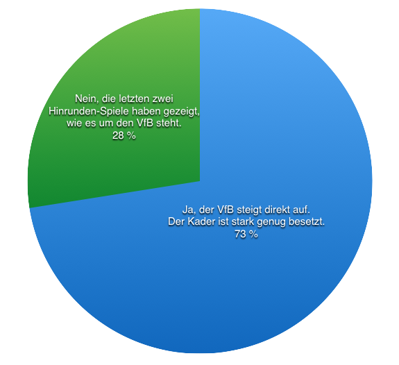 Von den Aufs und Abs haben die Fans des VfB Stuttgart genug. Sie wollen das Team von Trainer Hannes Wolf ab August 2017 wieder zurück in der ersten Liga sehen. Doch das Ende der Hinrunde mit den beiden Niederlagen gegen Hannover und Würzburg sitzt den meisten VfB-Anhängern noch in den Knochen. Trotzdem glauben 73% der Stuttgarter, die bei unserer Online-Umfrage mitgemacht haben, an die VfB-Rückkehr in die erste Bundesliga.