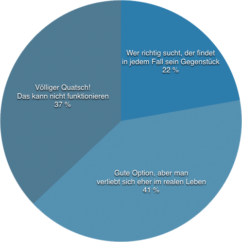 Mit 41% sind die meisten von euch der Meinung, im echten Leben kann man sich eher verlieben. Viele (37%) halten die Online-Börsen auch für völligen Unsinn. 22% der STUGGI.TV-User meinen, man findet immer seine große Liebe und muss eben richtig suchen. Zum Beispiel mit Hilfe solcher Seiten.