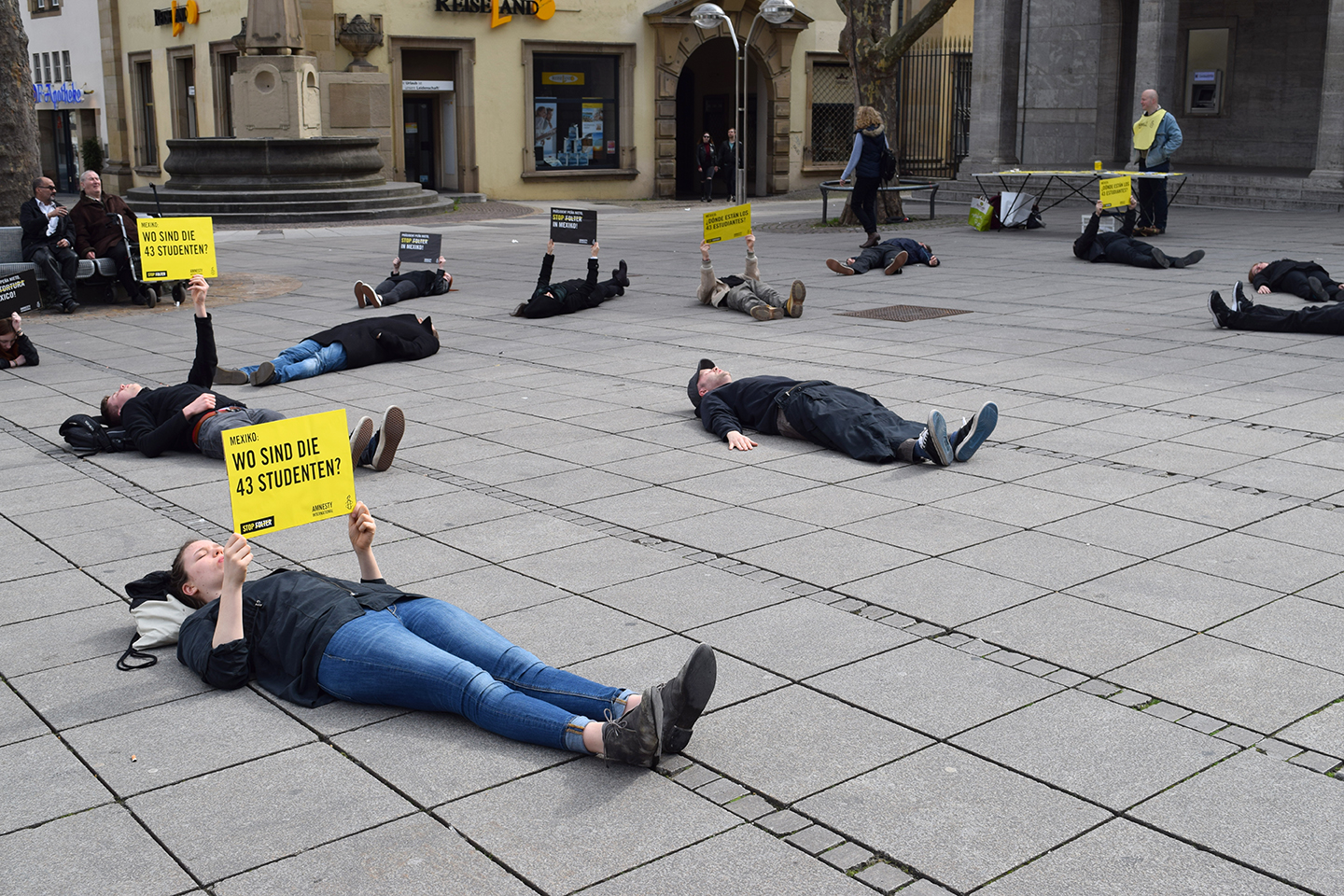 Am Sonntagnachmittag um 15 Uhr fanden sich die Amnesty Stuttgart Gruppen und weitere Interessierte vor der Commerzbank am Schlossplatz zusammen. Alle waren schwarz gekleidet. Auf ein Zeichen hin warfen sich die Anwesenden zu Boden und verharrten 5 Minuten in dieser Stellung. Damit sollte das Verschwinden der Studenten symbolisiert werden. Wie das aussah, seht ihr hier:
