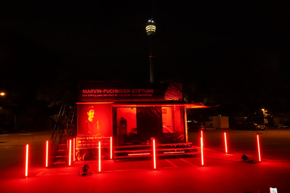 Ein Wagen der Marvin-Puchmeier-Stiftung vor dem Fernsehturm während der Night of Light 2021 in Stuttgart. (Foto: STUGGI.TV)