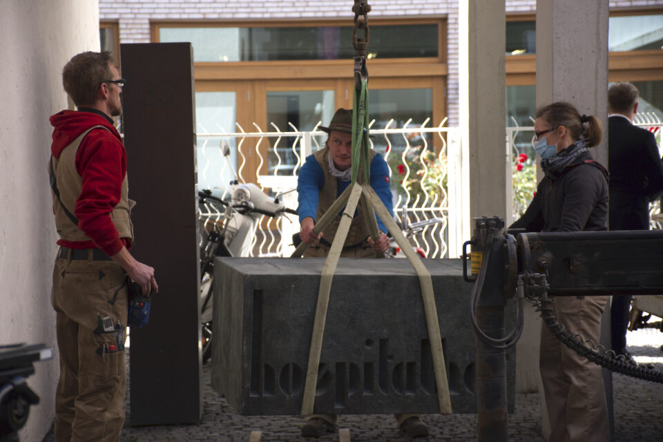 Erst wird der Grundstein mit einem Kran vom Transporter gehoben. (Foto: STUGGI.TV)
